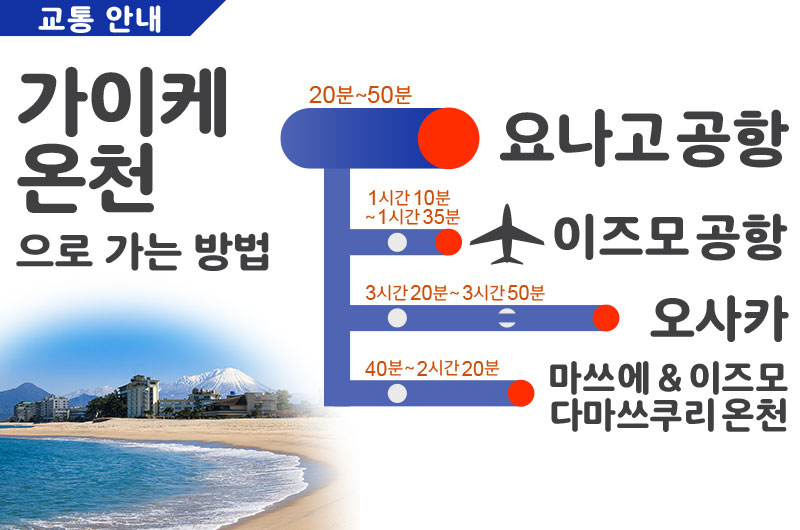 요나고 공항에서 가이케 지역으로 가시려면, 직통버스를, 이즈모 공항에서 오는 경우, JR 일반선과 노선버스를, 오사카에서 오는 경우, JR 특급…