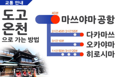 마쓰야마 공항에서 도고 지역으로 가시려면, 공항버스를, 오카야마, 다카마쓰에서 오는 경우, 직통 특급을, 히로시마에서 오는 경우, 고속선을...