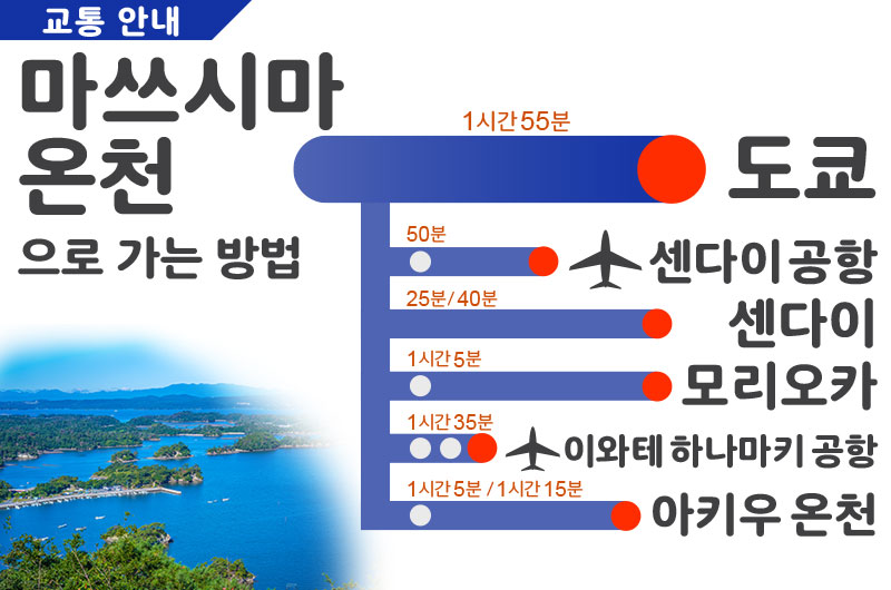 센다이 공항에서 마쓰시마 지역으로 가시려면, 철도와 JR 일반선을, 도쿄, 센다이, 모리오카, 이와테 하나마키 공항에서 오는 경우, JR 신칸센과 JR 일반선을 이용하실 수 있습니다. 아키우 온천에서 마쓰시마 온천으로 가시려면, 노선버스와 JR 일반선을 이용하실 수 있습니다….