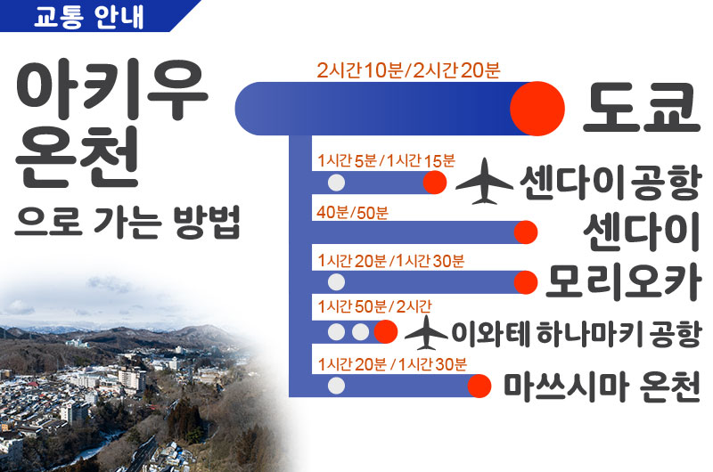 센다이 공항에서 아키우 지역으로 가시려면, 철도와 노선버스를, 센다이에서 오는 경우, 노선버스를, 도쿄, 모리오카, 이와테 하나마키 공항에서 오는 경우, JR 신칸센과 노선버스를 이용하실 수 있습니다. 마쓰시마 온천에서 아키우 온천으로 가시려면, JR 일반선과 노선버스를 이용하실 수 있습니다….