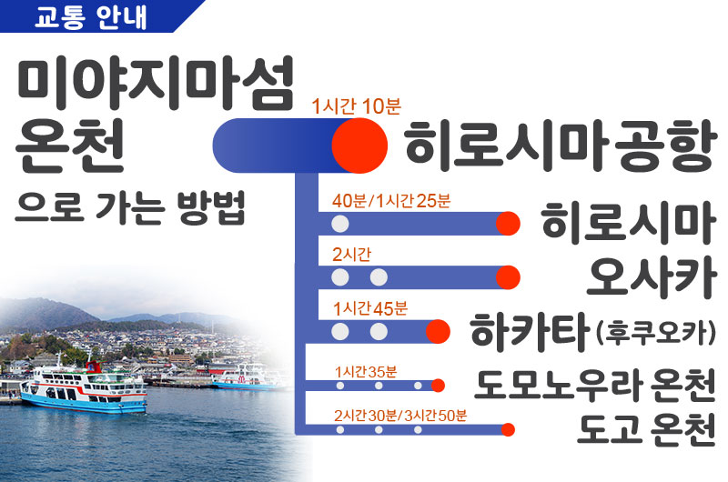 히로시마 공항에서 미야지마섬 지역으로 가시려면, 직통버스를, 히로시마 역에서 오는 경우, JR 일반선 또는 철도를, 오사카, 하카타(후쿠오카)에서 오는 경우, JR 신칸센과 일반선을 이용하실 수 있습니다. 도모노우라 온천에서 미야지마섬 온천으로 가시려면, JR 신칸센과 일반선을, 도고 온천에서 오는 경우, 고속선을 이용하실 수 있습니다….